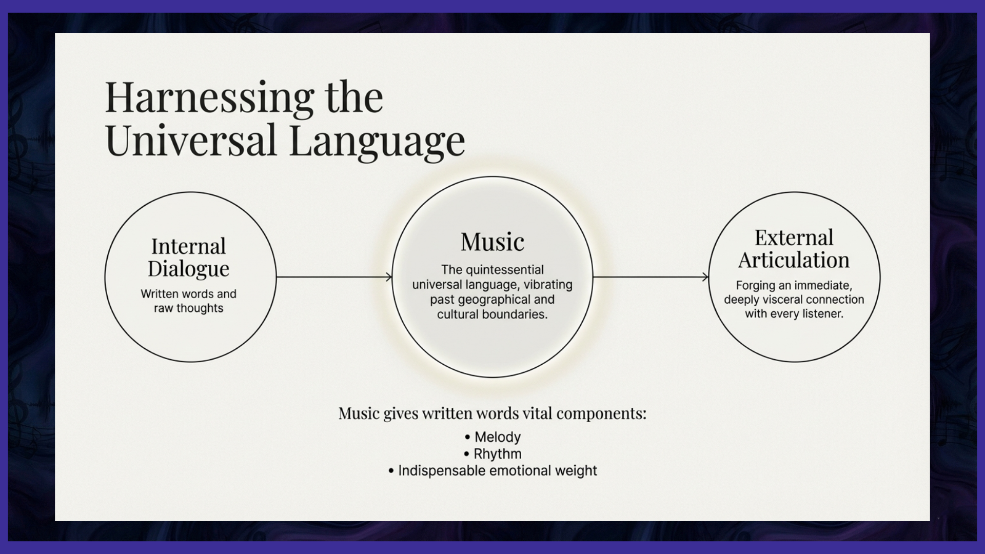 This newly chartered creative path was immediately, and inextricably, linked to what I recognized as the world's most universal language: music. From the project's inception, I understood music to be far more than a medium for casual entertainment or a passive backdrop to daily life. I saw it, unequivocally, as the quintessential universal language, a vibrational force capable of effortlessly transcending geographical, linguistic, and cultural boundaries, resonating deep within the core of the shared human spirit. This core insight crystallized my fundamental artistic belief: by harnessing the intrinsic power, rhythm, and emotion of music, I could breathe undeniable life, urgency, and memorability into my carefully chosen, written words. Music would gift them essential melody, rhythm, and indispensable emotional weight, thereby forging an immediate, deeply visceral, and felt connection with every single listener.