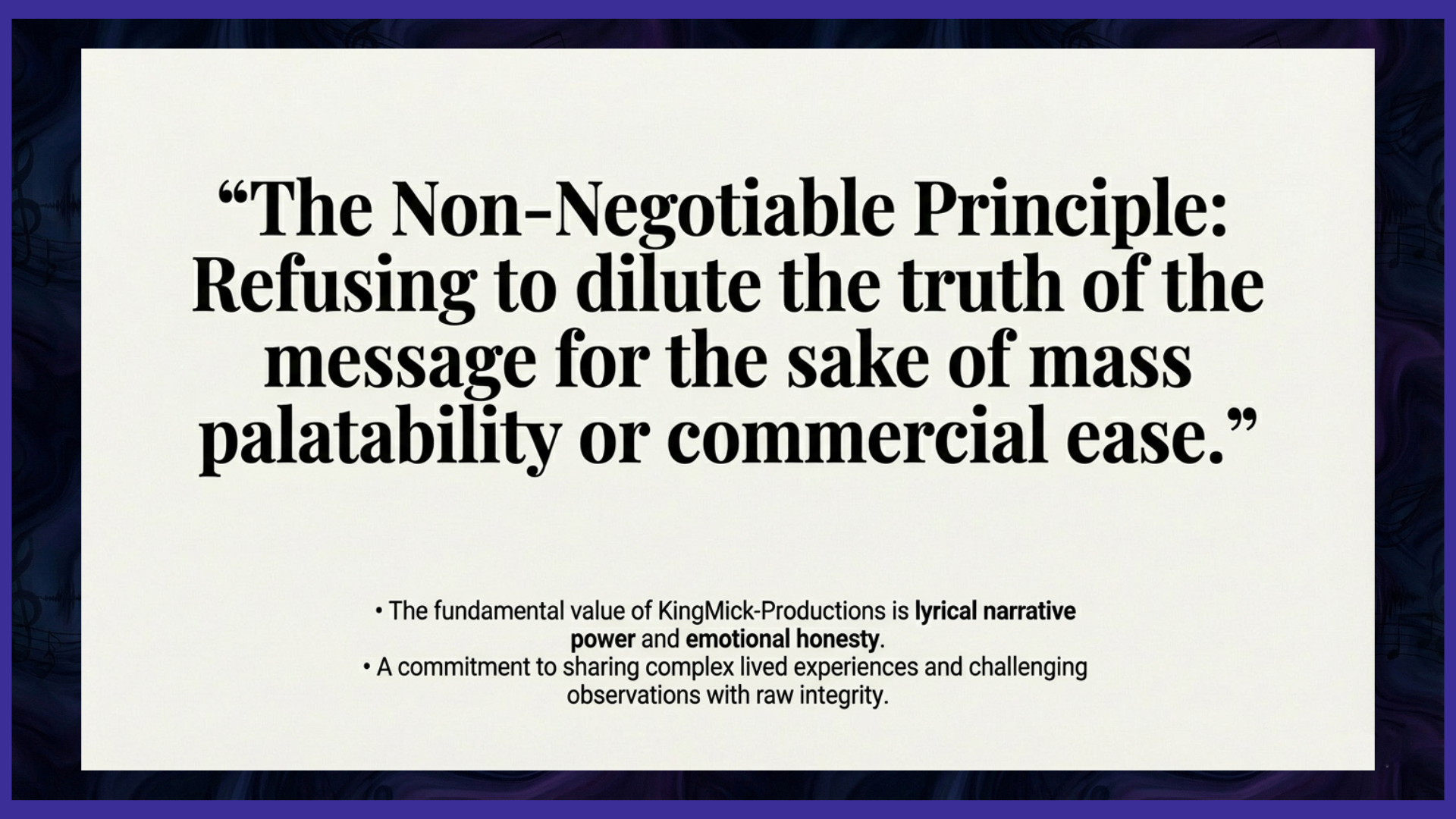 The essence, the driving force, and the fundamental value of KingMick-Productions are, therefore, rooted entirely in the narrative power and emotional honesty of its lyrics. I am compelled by an urgent, internal necessity to tell my story a unique, unvarnished chronicle of complex lived experiences, challenging observations, and deeply ingrained, often unconventional, beliefs. My artistic mandate is to articulate my innermost thoughts with an unflinching, sometimes raw, and always complete honesty, refusing to dilute the truth of the message for the sake of mass palatability or commercial ease. This commitment to lyrical and narrative integrity is not merely a preference; it is the paramount, non-negotiable principle of the entire enterprise.