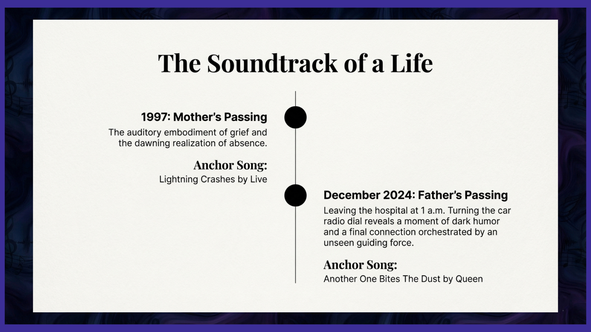 A similar, yet starkly different, auditory signpost arrived much later, in December 2024. After spending my final, gut-wrenching hours at the hospital and saying my last farewell to my father, I climbed into my car, physically and emotionally drained, around 1 a.m. I turned the key and instinctively switched on the radio. The airwaves were thick with static for a moment, then coalesced around the pulsating, unmistakable bass line of "Another One Bites The Dust" by Queen.