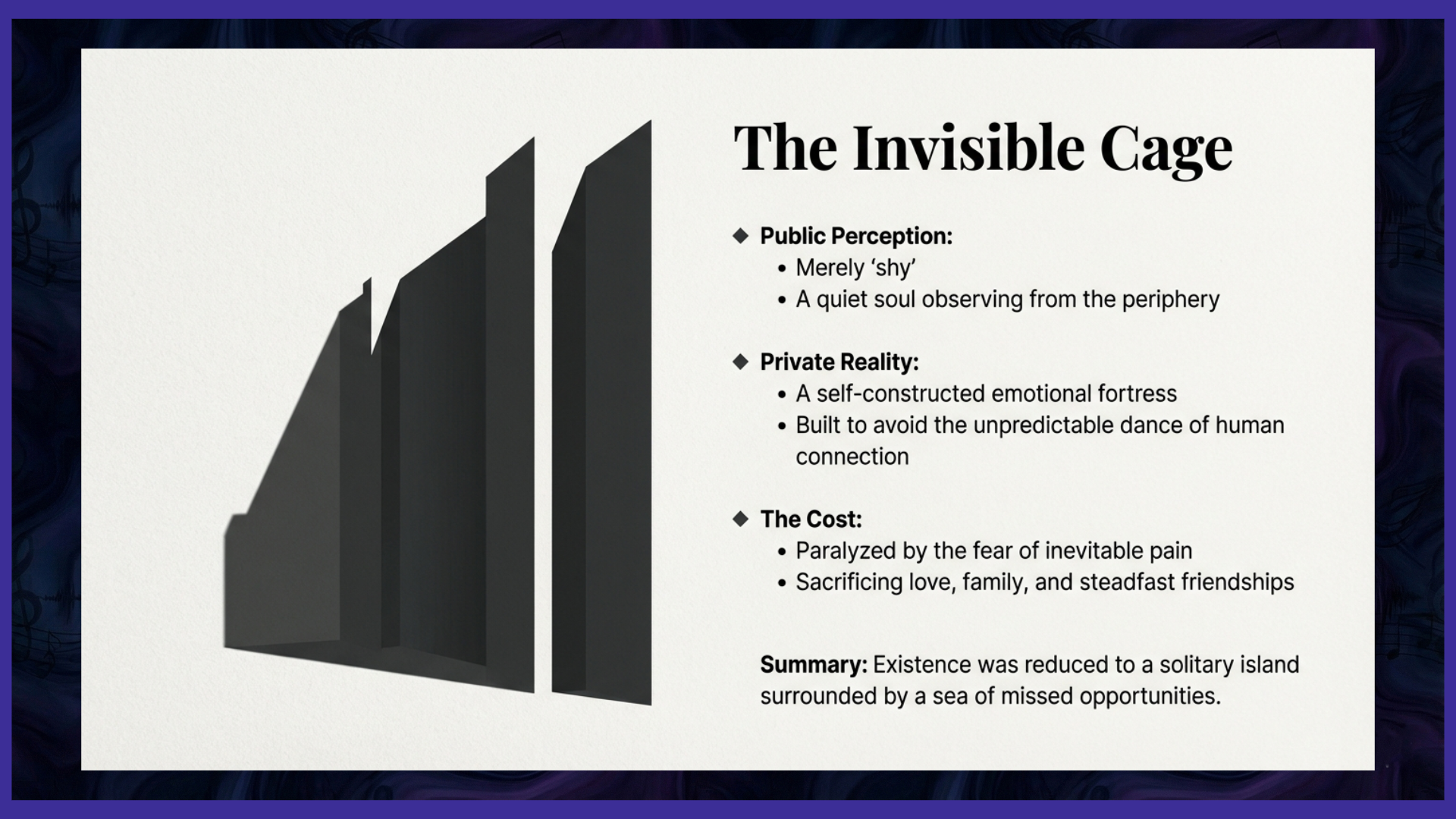 Beneath this stoic facade, an aching void yearned for what it simultaneously recoiled from. I craved affection, the warmth of genuine connection, the simple comfort of shared laughter and understanding. Yet, the very thought of emotional wounds, of the searing sting of betrayal or rejection, caused me to recoil, pushing potential connections further into the realm of the unattainable. This pervasive fear became a self-fulfilling prophecy, constructing an invisible cage that prevented me from experiencing a vast spectrum of life's richest offerings. Immeasurable life experiences, moments of profound joy and shared sorrow, were sacrificed at the altar of my fear. Love, in its purest and most profound forms, genuine affection, the incomparable joy of raising a family, and the unwavering support of steadfast friendships all remained tantalizingly out of reach, forever beyond the wall I had so painstakingly erected. My existence was a solitary island, surrounded by a turbulent sea of what-ifs and missed opportunities.