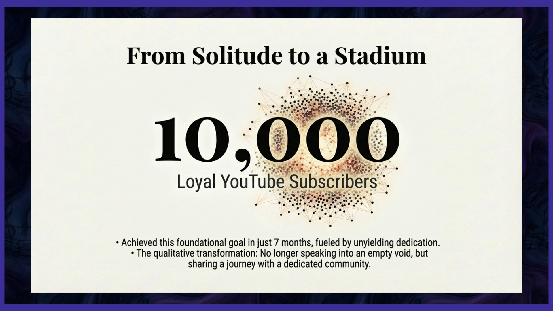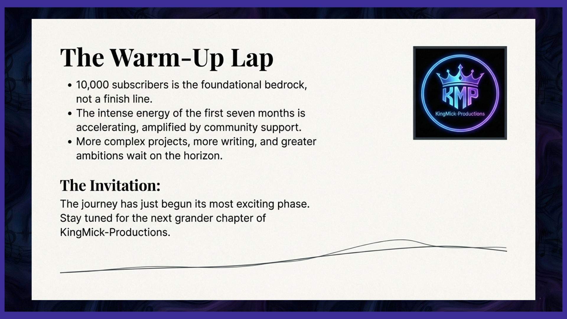 However, let this significant milestone/this initial victory not be misinterpreted by anyone as a finish line or a signal to slow down. I am far from finished; in truth, I feel, with renewed energy and purpose, as though I have only just completed the necessary warm-up lap. The 10,000 subscribers represent the solid, foundational bedrock upon which something much larger, more ambitious, and more impactful is actively being built. The energy, the passion, and the fierce commitment that fueled the intense creation of these initial seven months are not diminishing; they are accelerating, being amplified by the community's support. There is so much more content waiting to be written, so many more complex projects waiting to be produced, and so many greater ambitions waiting on the creative horizon. The journey has only just begun its most exciting phase, and I enthusiastically invite everyone who is listening to stay tuned, to remain engaged, and to witness the next, far grander chapter of KingMick-Productions unfold.