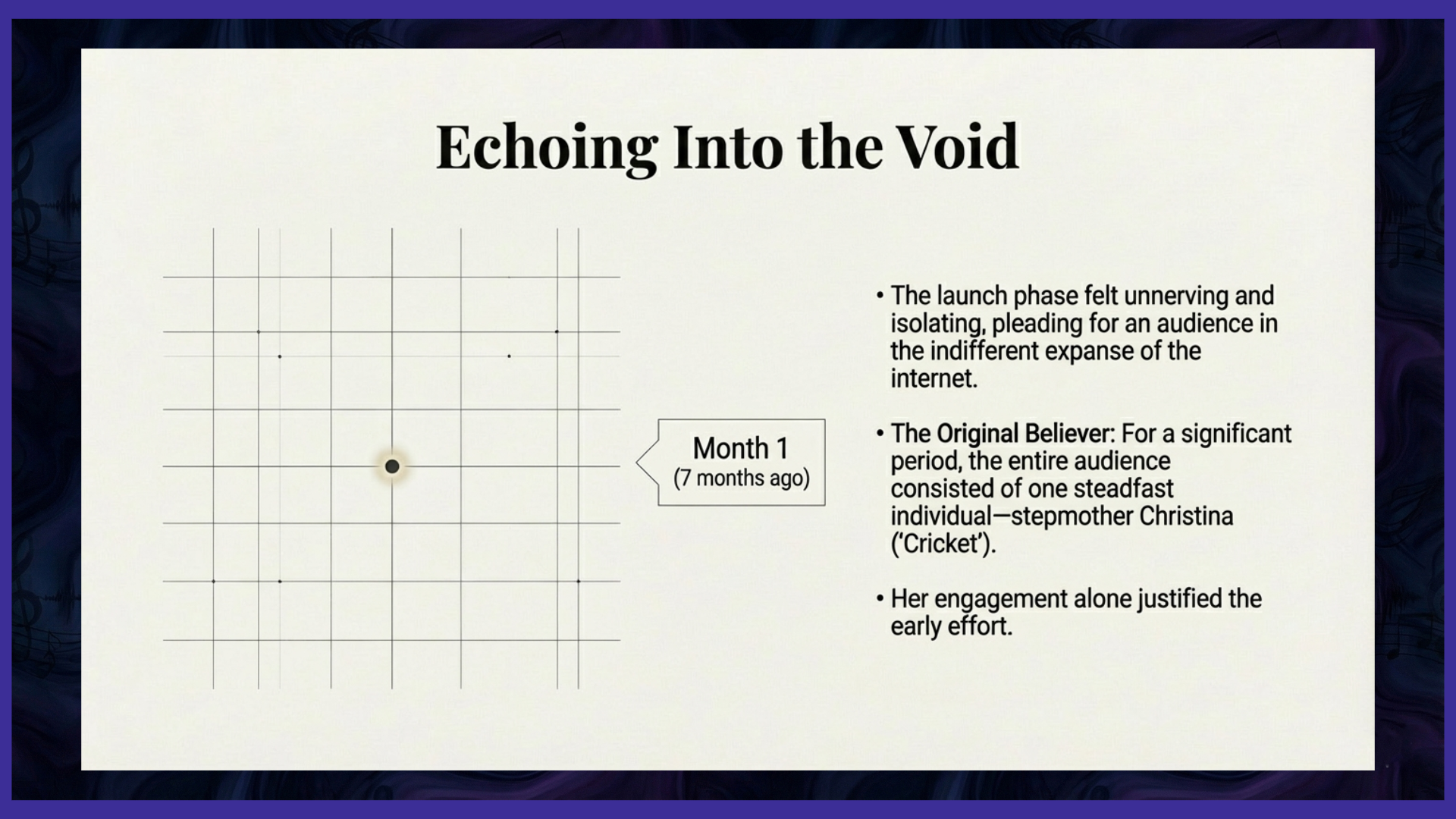 The very beginning was indeed humble, almost comically so in retrospect. Just seven short months ago, my entire known audience consisted of one steadfast, unwavering individual: my stepmother, Christina, whom we affectionately call "Cricket." She was the original believer, the first listener, and, for a significant period, the only person consistently engaging with and encouraging the content I poured my energy, time, and resources into creating. Her presence alone was enough to justify the effort.