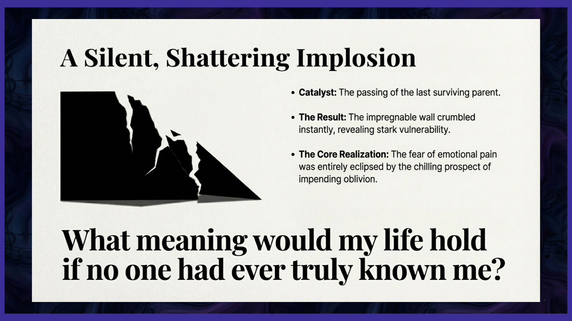 Then came the seismic shift, a profound moment that irrevocably altered the landscape of my carefully constructed world. It was the moment my last surviving parent transitioned to their heavenly home. In that profound confluence of grief and finality, the impregnable wall I had so painstakingly built over decades came not with a roar, but with a silent, shattering implosion. The foundations, once thought unshakeable, crumbled into dust, revealing the stark, terrifying vulnerability that lay beneath. In the echoing silence of their absence, a terrifying realization dawned upon me. I began to contemplate my mortality with an unprecedented clarity, envisioning how I would be remembered, what my legacy would truly be as my time on this earth drew ever closer. What meaning, I pondered with a chilling clarity, would my life hold if no one had ever truly known me, if my authentic self remained forever hidden behind the ruins of my self-made fortress? The fear of hurt, once my formidable protector and constant companion, now paled in comparison to the chilling prospect of a life lived, and ended, in utter solitude, leaving no ripple, no enduring mark, in the vast, interconnected ocean of human experience. The silence of my impending oblivion became a far greater terror than any potential pain of connection.