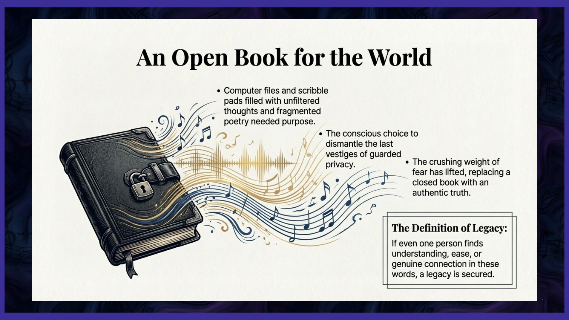 I understand that some may wonder why I am now doing this, why I am choosing to dismantle the last vestiges of my carefully guarded privacy. The answer lies in the countless hours I have spent in introspection, meticulously writing down my thoughts, exploring the myriad "what ifs," and contemplating what actions I would take if granted a second chance at a truly lived life. Right now, I believe, with a profound sense of urgency, that I have no legacy, nothing tangible or intangible to leave my mark on this world. This, then, is my desperate attempt to forge one. I want this to be my legacy: all these files on my computer, filled with raw, unfiltered thoughts, the scribble pads overflowing with random reflections and fragmented poetry. They have to be worth something, something by which I can be remembered, something that speaks of a life, however flawed, that was lived and deeply felt. And if someone, somewhere, is put at ease, finds a flicker of understanding, or experiences a moment of genuine connection by something they see or read from me, then there's my legacy that's how I will be remembered. The crushing weight of fear, which once dictated every choice, has finally lifted. My closed book of thoughts, once meticulously guarded and hidden from prying eyes, is now an open one for the world to see, a testament to a life finally embracing its authentic truth.