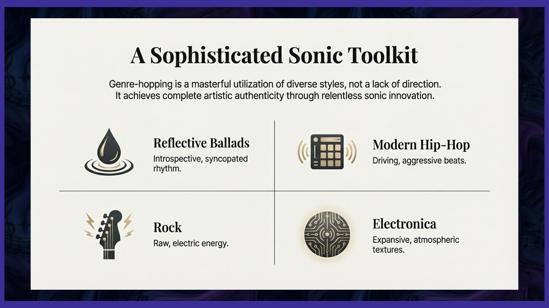 Furthermore, a crucial and genuinely distinguishing element of my creative vision involves the strategic and masterful utilization of diverse music genres. I consciously employ this genre-hopping approach not as a symptom of a lack of direction or a failure to commit to a single style, but rather as a versatile, sophisticated, and comprehensive toolkit.
